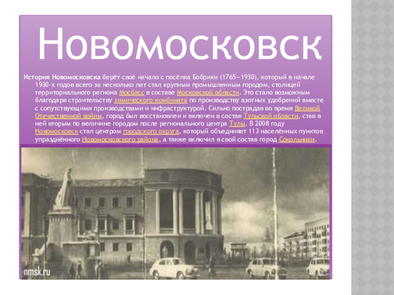 НовомосковскИстория Новомосковска берёт своё начало с посёлка Бобрики (1765—1930), который в начале 1930-х годов всего за несколько лет стал крупным промышленным городом, столицей территориального региона Мосбасс в составе Московской области. Это стало возможным благодаря строительству
