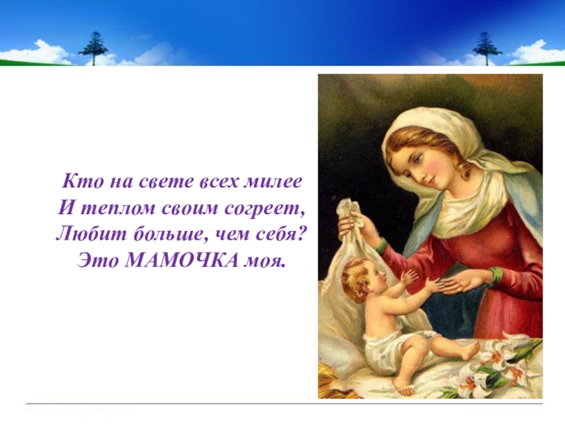 Кто на свете всех милееИ теплом своим согреет,Любит больше, чем себя?Это МАМОЧКА моя.