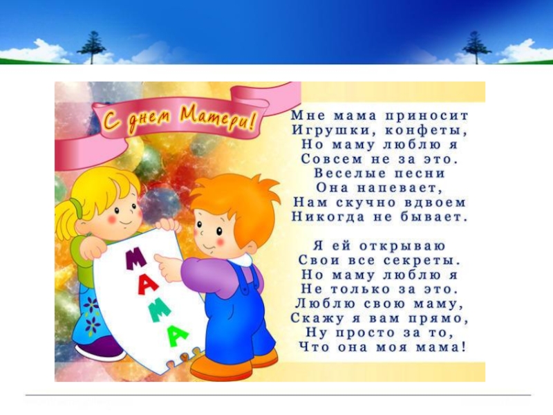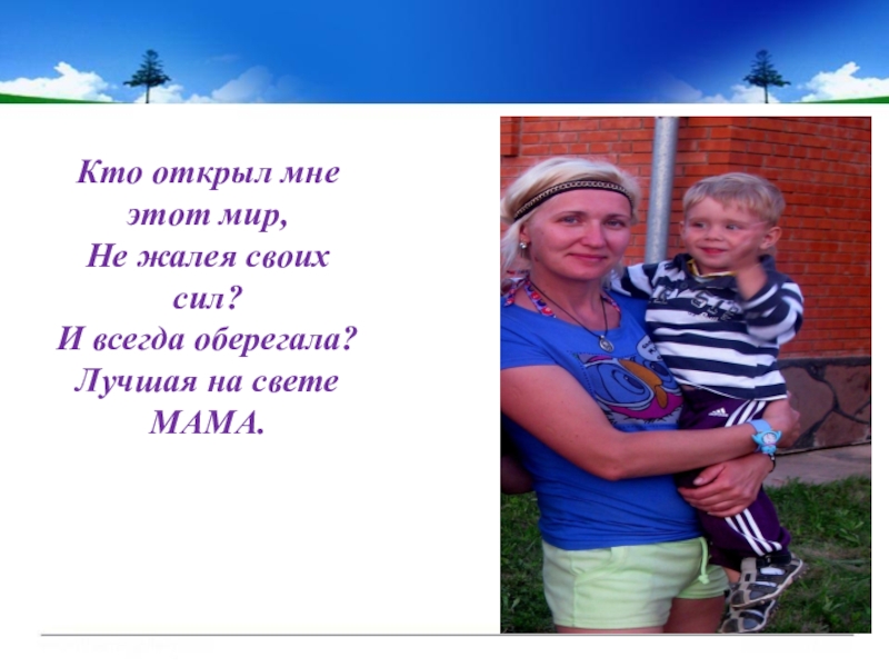 Кто открыл мне этот мир,Не жалея своих сил?И всегда оберегала?Лучшая на свете МАМА.