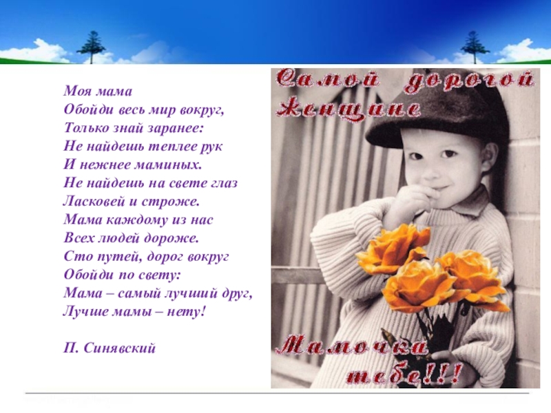 Моя мама Обойди весь мир вокруг, Только знай заранее: Не найдешь теплее рук И нежнее маминых. Не