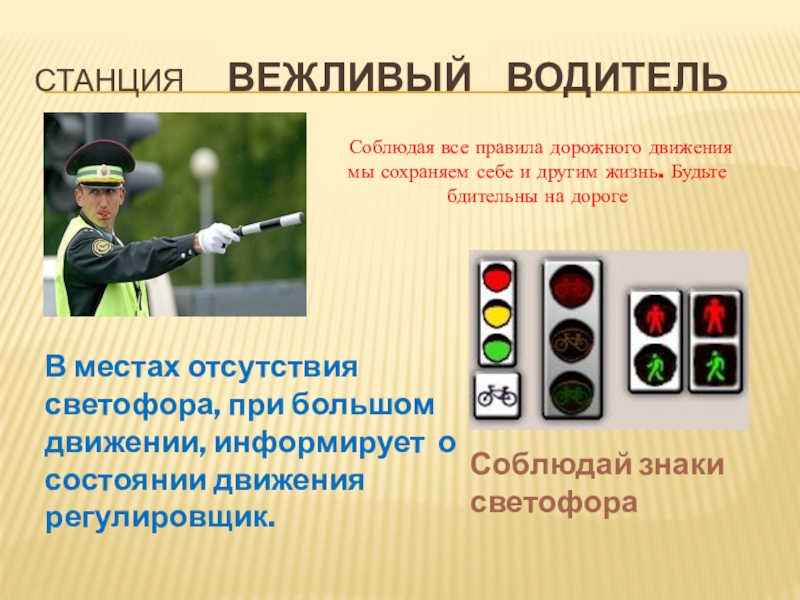 В местах отсутствия светофора, при большом движении, информирует о состоянии движения регулировщик.