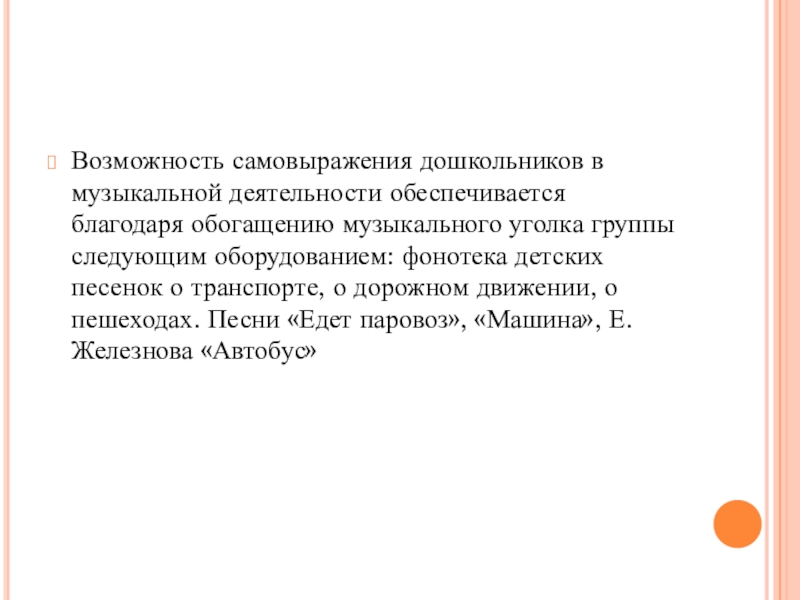 группы следующим оборудованием: фонотека детских песенок о транспорте, о дорожном движении, о пешеходах. Песни «Едет паровоз», «Машина», Е. Железнова «Автобус»