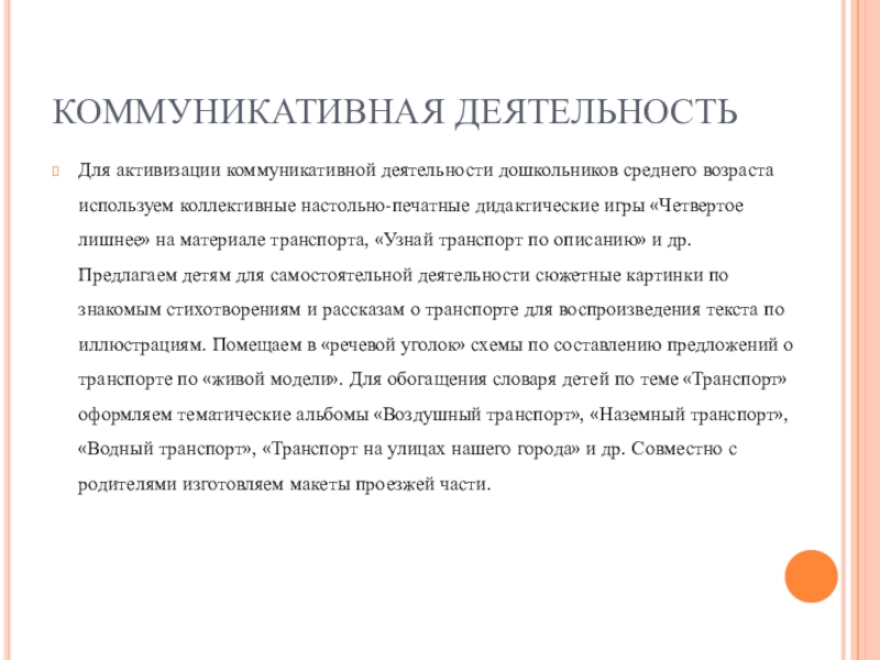 дидактические игры «Четвертое лишнее» на материале транспорта, «Узнай транспорт по описанию» и др. Предлагаем детям для самостоятельной деятельности сюжетные картинки по знакомым стихотворениям и рассказам о транспорте для воспроизведения текста по иллюстрациям. Помещаем в «речевой уголок» схемы по составлению предложений о транспорте по «живой модели». Для обогащения словаря детей по теме «Транспорт» оформляем тематические альбомы «Воздушный транспорт», «Наземный транспорт», «Водный транспорт», «Транспорт на улицах нашего города» и др. Совместно с родителями изготовляем макеты проезжей части.