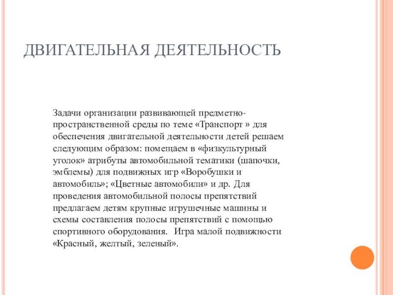 обеспечения двигательной деятельности детей решаем следующим образом: помещаем в «физкультурный уголок» атрибуты автомобильной тематики (шапочки, эмблемы) для подвижных игр «Воробушки и автомобиль»; «Цветные автомобили» и др. Для проведения автомобильной полосы препятствий предлагаем детям крупные игрушечные машины и схемы составления полосы препятствий с помощью спортивного оборудования. Игра малой подвижности «Красный, желтый, зеленый».