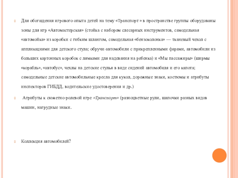 Слайд 3Для обогащения игрового опыта детей на тему «Транспорт » в пространстве