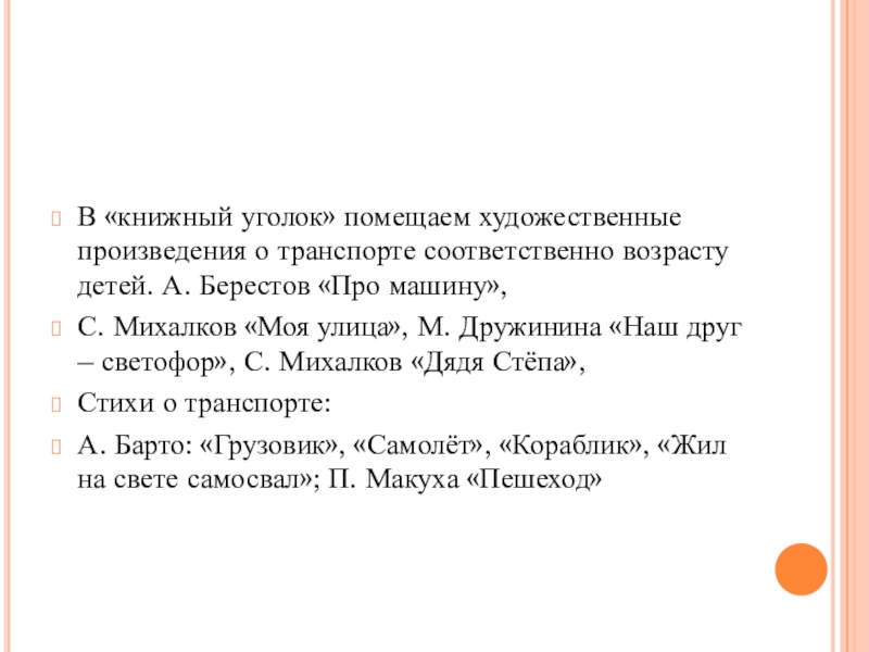 В «книжный уголок» помещаем художественные произведения о транспорте соответственно возрасту детей.