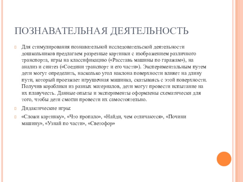 изображением различного транспорта, игры на классификацию («Расставь машины по гаражам»), на анализ и синтез («Соедини транспорт и его части»). Экспериментальным путем дети могут определить, насколько угол наклона поверхности влияет на длину пути, который проезжает игрушечная машинка, скатываясь с этой поверхности. Получив кораблики из разных материалов, дети могут провести испытание на их плавучесть. Данные опыты и эксперименты оформлены схематически для того, чтобы дети смогли провести их самостоятельно.