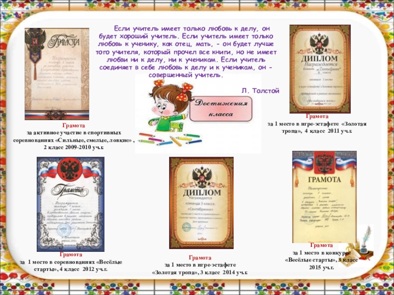 за 1 место в игре-эстафете «Золотая тропа», 3 класс 2014 уч.г.