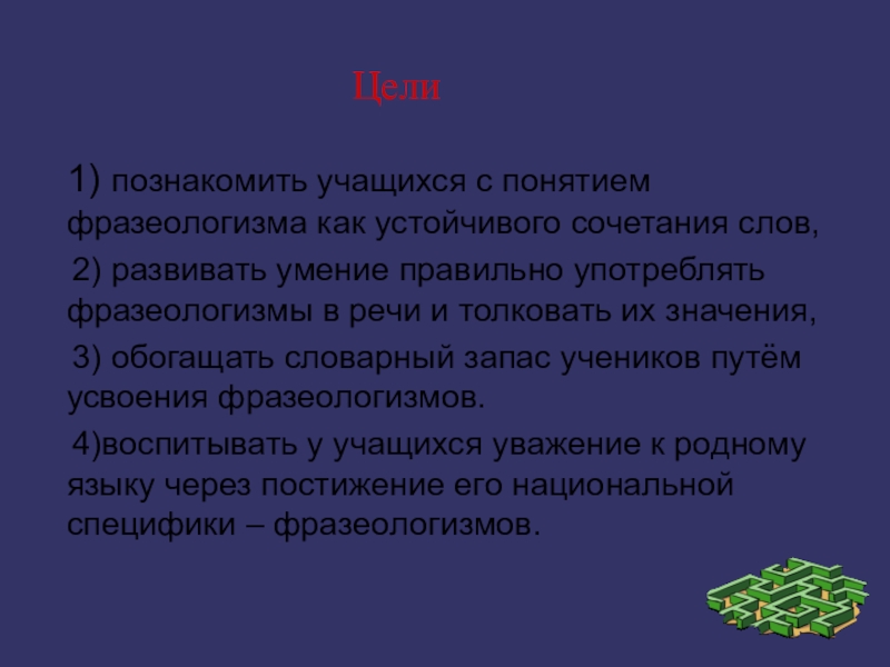 1) познакомить учащихся с понятием фразеологизма как устойчивого