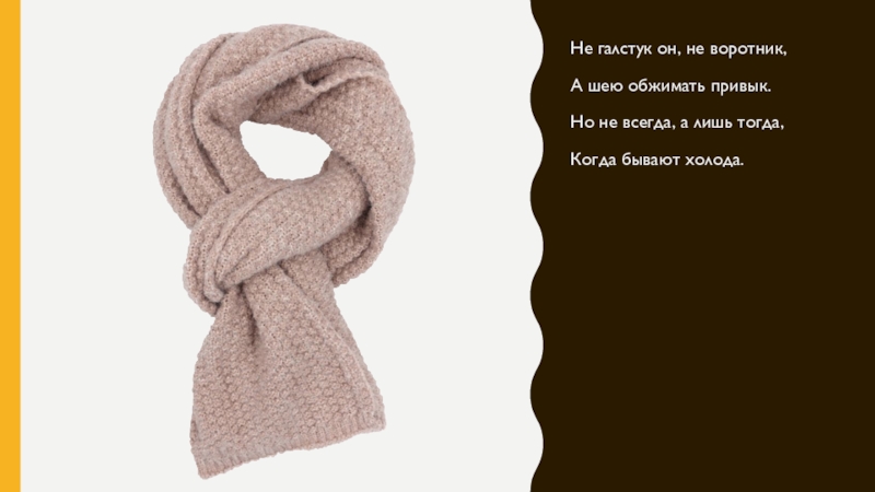Не галстук он, не воротник,А шею обжимать привык.Но не всегда, а лишь тогда,Когда бывают холода.