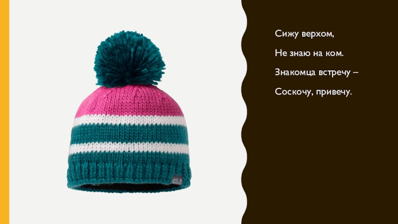Сижу верхом,Не знаю на ком.Знакомца встречу –Соскочу, привечу.