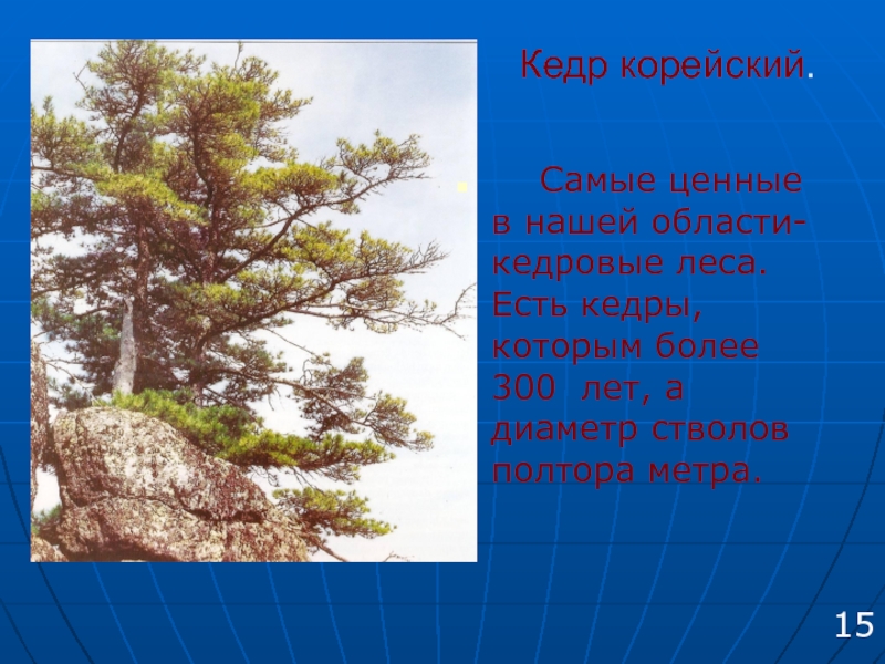 Самые ценные в нашей области- кедровые леса. Есть кедры, которым более 300 лет, а диаметр стволов полтора метра.