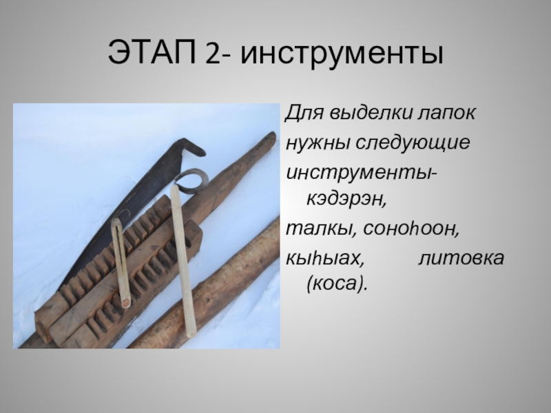 ЭТАП 2- инструментыДля выделки лапокнужны следующие инструменты- кэдэрэн, талкы, соноhоон, кыhыах, литовка (коса).