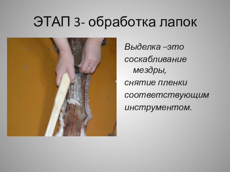ЭТАП 3- обработка лапокВыделка –этососкабливание мездры, снятие пленки соответствующим инструментом.