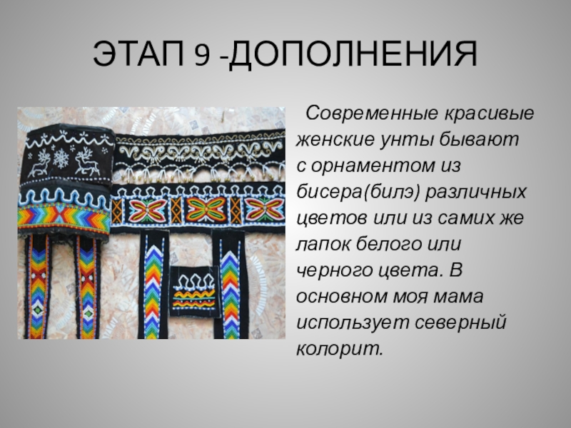 ЭТАП 9 -ДОПОЛНЕНИЯ Современные красивые женские унты бывают с орнаментом избисера(билэ) различных цветов или из самих же