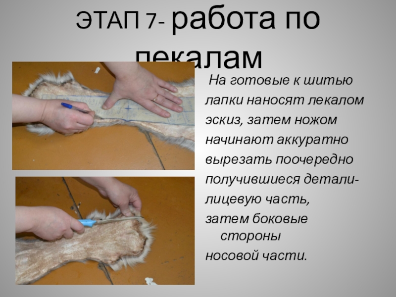 ЭТАП 7- работа по лекалам На готовые к шитьюлапки наносят лекаломэскиз, затем ножом начинают аккуратно вырезать поочередно