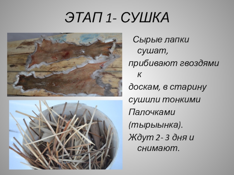 ЭТАП 1- СУШКА Сырые лапки сушат,прибивают гвоздями кдоскам, в старину сушили тонкими Палочками(тырыынка).Ждут 2- 3 дня и