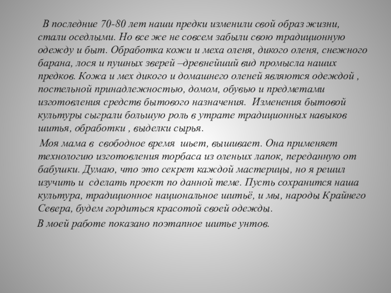 свой образ жизни, стали оседлыми. Но все же не совсем забыли свою традиционную одежду и быт. Обработка кожи и меха оленя, дикого оленя, снежного барана, лося и пушных зверей –древнейший вид промысла наших предков. Кожа и мех дикого и домашнего оленей являются одеждой , постельной принадлежностью, домом, обувью и предметами изготовления средств бытового назначения. Изменения бытовой культуры сыграли большую роль в утрате традиционных навыков шитья, обработки , выделки сырья.