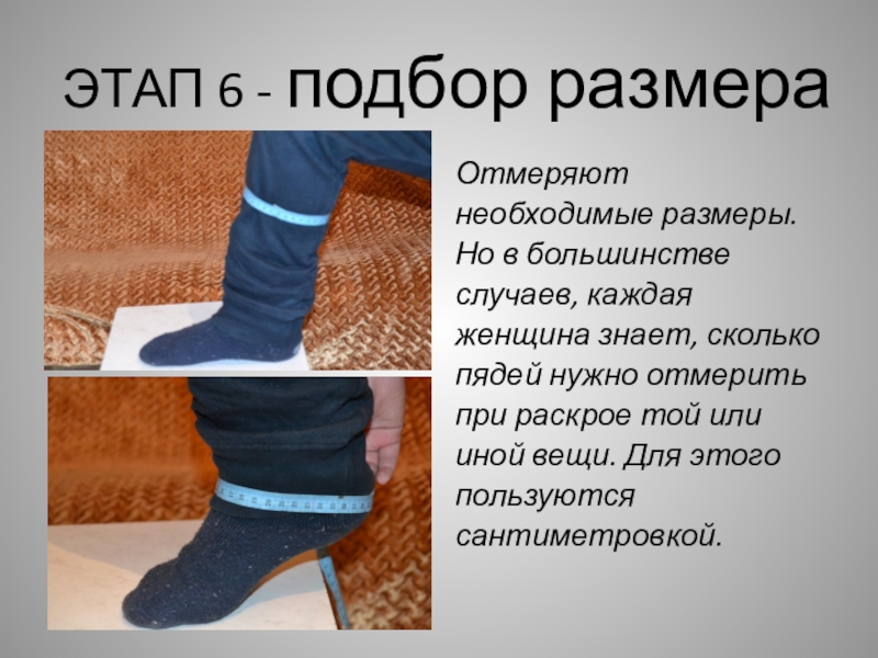 ЭТАП 6 - подбор размераОтмеряют необходимые размеры.Но в большинствеслучаев, каждая женщина знает, сколько пядей нужно отмерить при