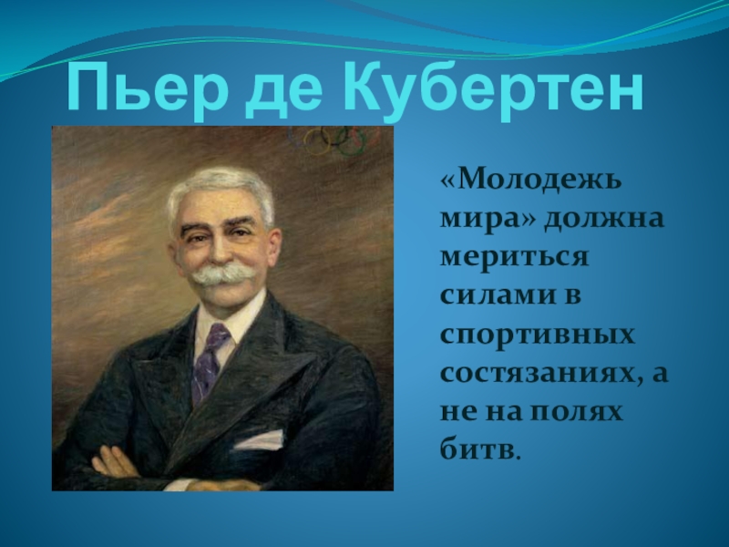 Пьер де Кубертен«Молодежь мира» должна мериться силами в спортивных состязаниях, а не на полях битв.