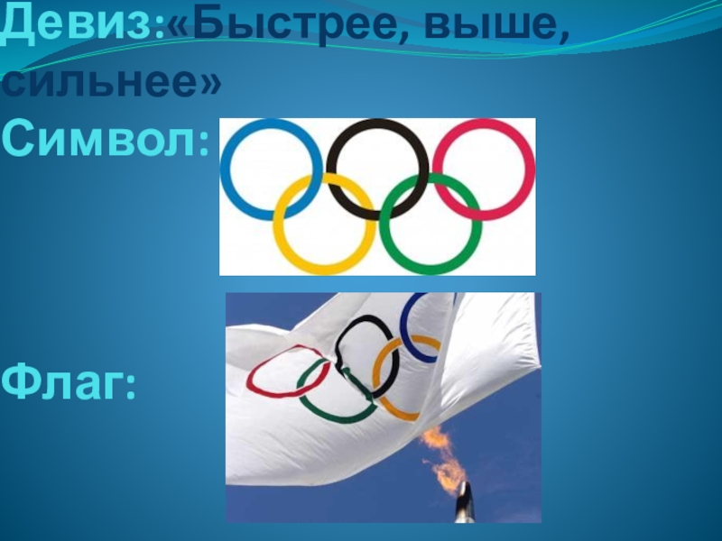 Слайд 4Девиз:«Быстрее, выше, сильнее» Символ: Флаг: