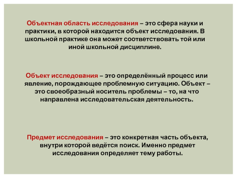 Предмет исследования – это конкретная часть объекта, внутри которой ведётся поиск. Именно предмет исследования определяет тему работы.