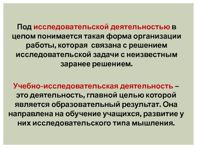 Под исследовательской деятельностью в целом понимается такая форма организации работы, которая связана с решением исследовательской задачи с неизвестным заранее решением.