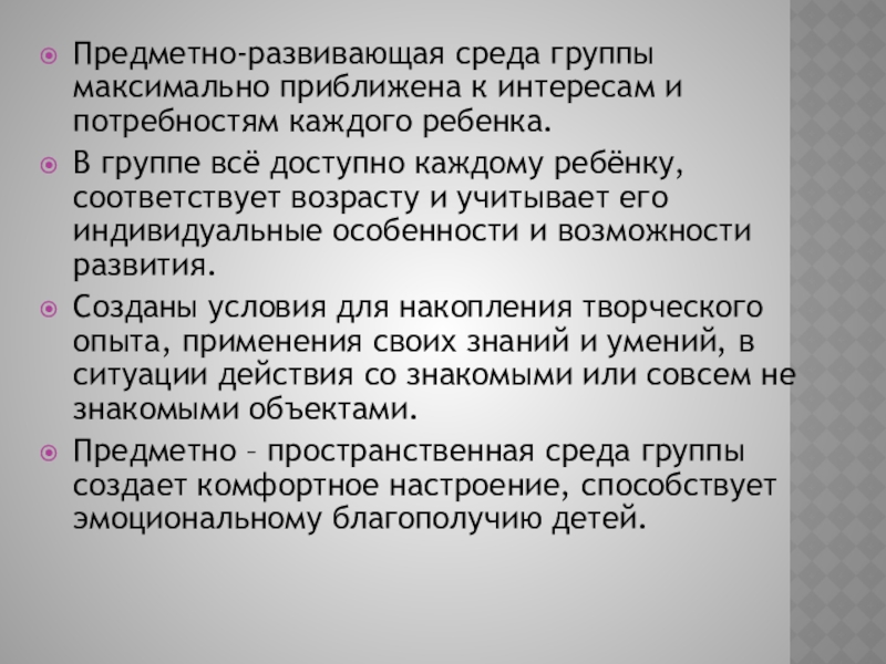 Слайд 15Предметно-развивающая среда группы максимально приближена к интересам и потребностям каждого ребенка.