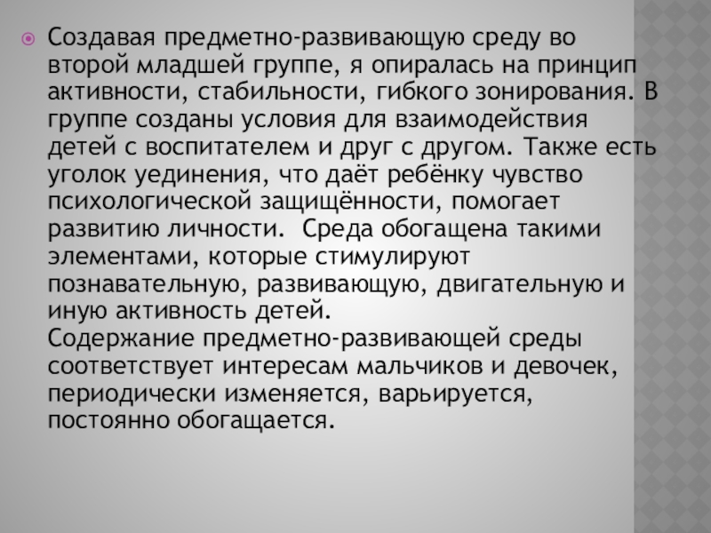 Слайд 3Создавая предметно-развивающую среду во второй младшей группе, я опиралась на принцип