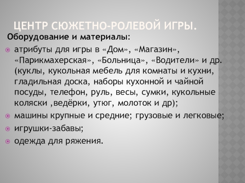 «Больница», «Водители» и др. (куклы, кукольная мебель для комнаты и кухни, гладильная доска, наборы кухонной и чайной посуды, телефон, руль, весы, сумки, кукольные коляски ,ведёрки, утюг, молоток и др);