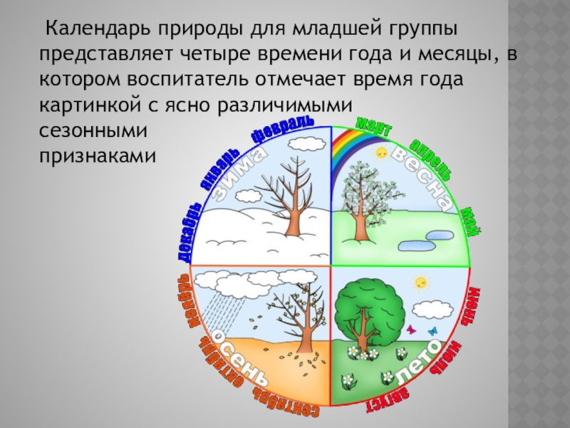 Слайд 5 Календарь природы для младшей группы представляет четыре времени года и