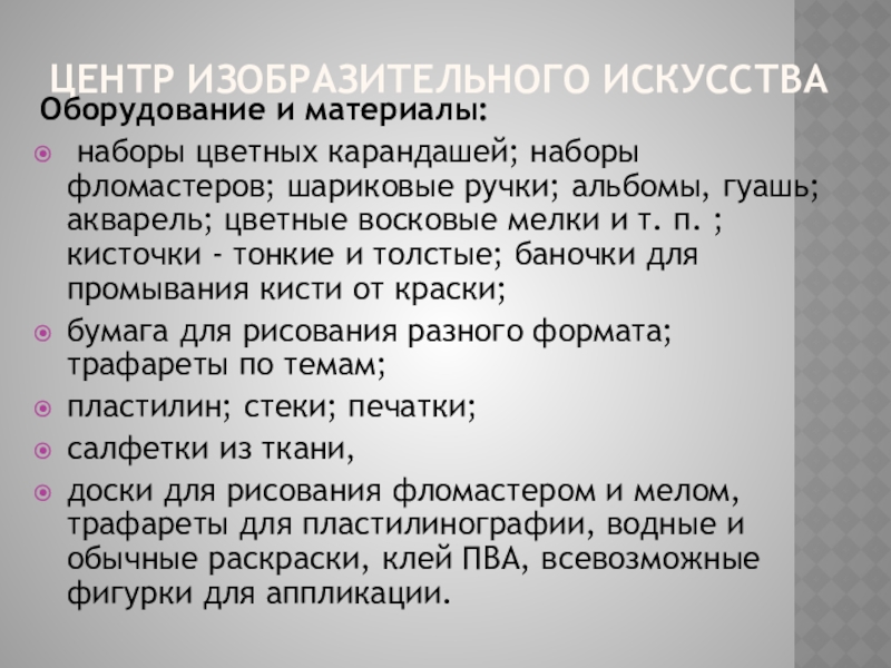 ручки; альбомы, гуашь; акварель; цветные восковые мелки и т. п. ; кисточки - тонкие и толстые; баночки для промывания кисти от краски;