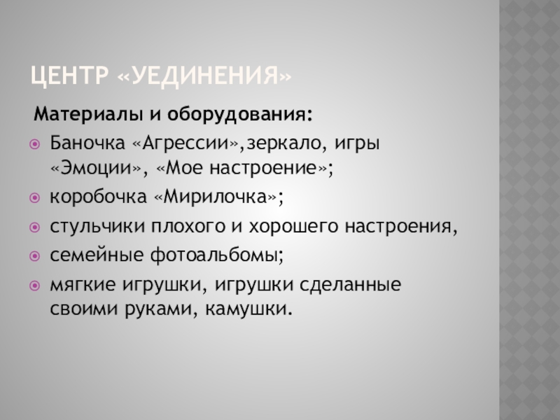 Баночка «Агрессии»,зеркало, игры «Эмоции», «Мое настроение»;