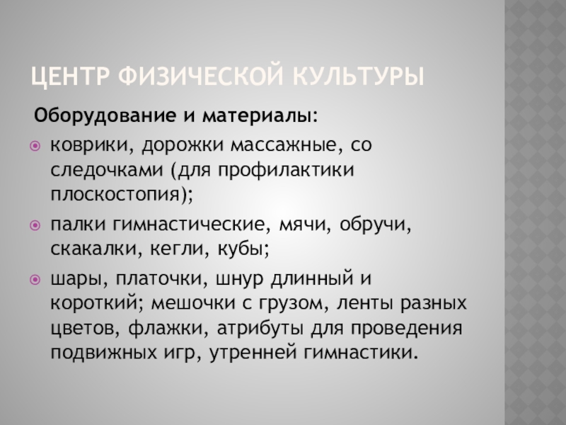шары, платочки, шнур длинный и короткий; мешочки с грузом, ленты разных цветов, флажки, атрибуты для проведения подвижных игр, утренней гимнастики.