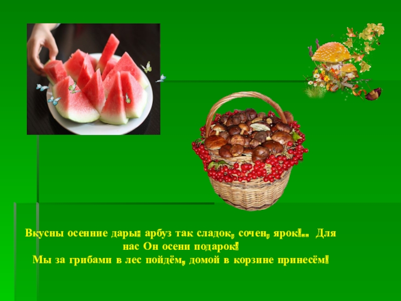 Вкусны осенние дары: арбуз так сладок, сочен, ярок!.. Для нас Он осени подарок!  Мы за грибами