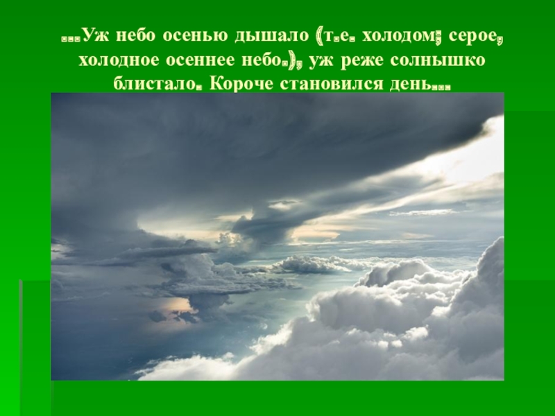 Слайд 4…Уж небо осенью дышало (т.е. холодом; серое, холодное осеннее небо.), уж