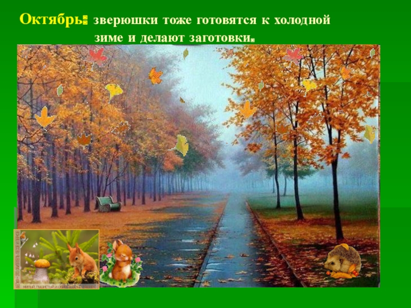 Слайд 21Октябрь: зверюшки тоже готовятся к холодной зиме и делают заготовки.