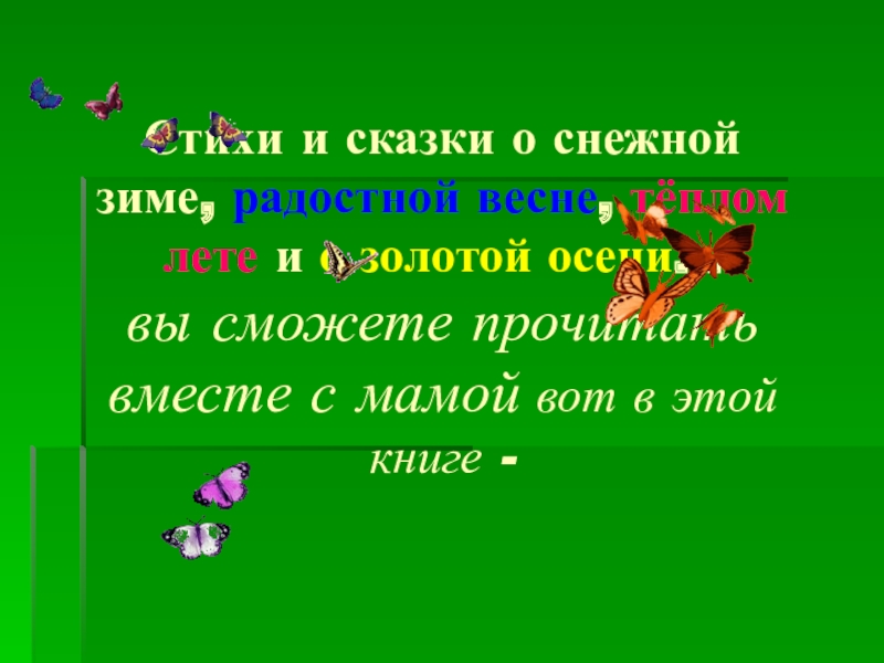 Слайд 23Стихи и сказки о снежной зиме, радостной весне, тёплом лете и
