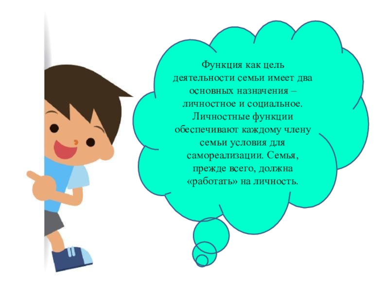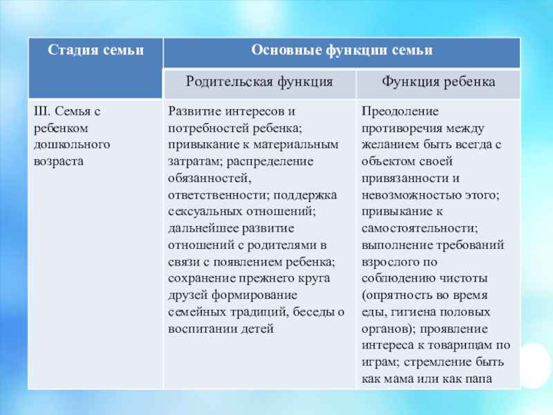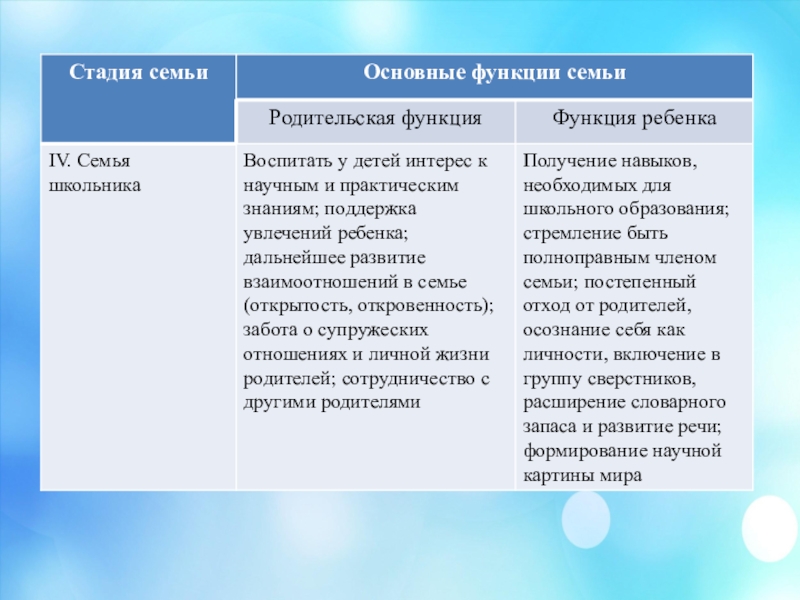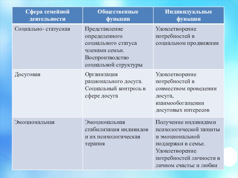 воспитательная (формирование личности ребенка, систематическое воспитательное воздействие семейного коллектива на каждого своего члена в течение всей его жизни, постоянное влияние детей на родителей и других взрослых членов семьи)