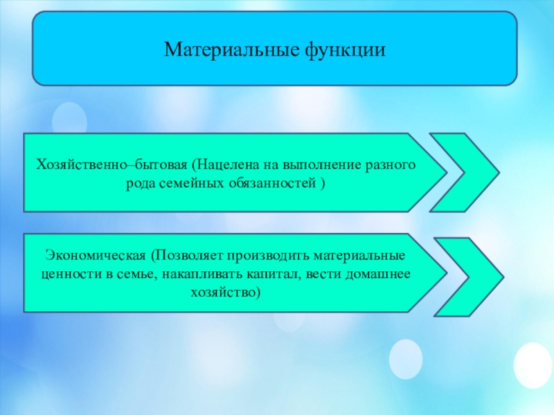 К ним относятся функции связанные с накоплением и передачей собственности, статуса, организацией производства и потребления, отдыха и досуга, с заботой о здоровье и благополучии членов семьи, с созданием микроклимата, способствующего снятию напряжений и самосохранению.