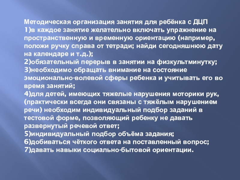 Слайд 7Методическая организация занятия для ребёнка с ДЦП