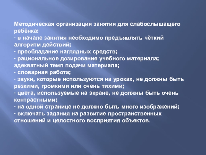 Слайд 9Методическая организация занятия для слабослышащего ребёнка: