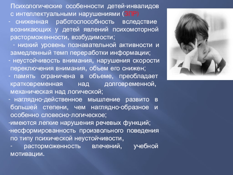 Слайд 13Психологические особенности детей-инвалидов с интеллектуальными нарушениями (ЗПР)