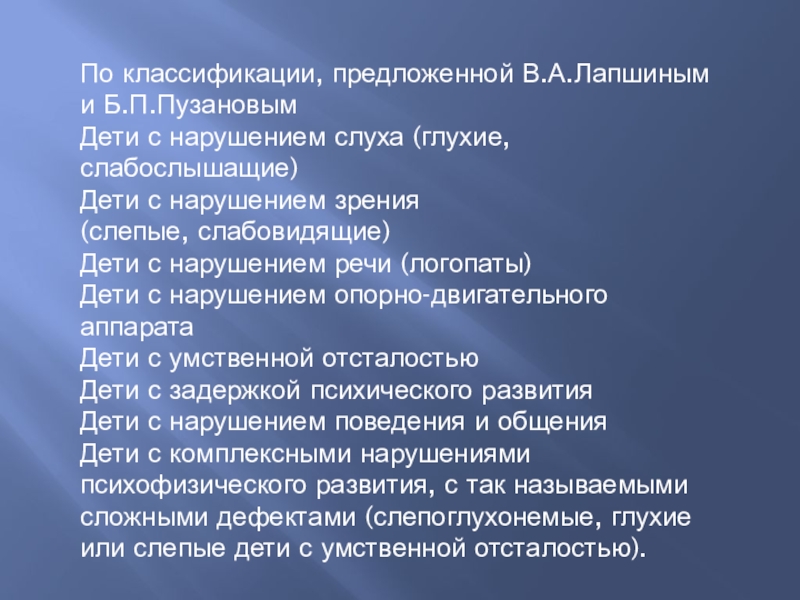 Дети с комплексными нарушениями психофизического развития, с так называемыми сложными дефектами (слепоглухонемые, глухие или слепые дети с умственной отсталостью).