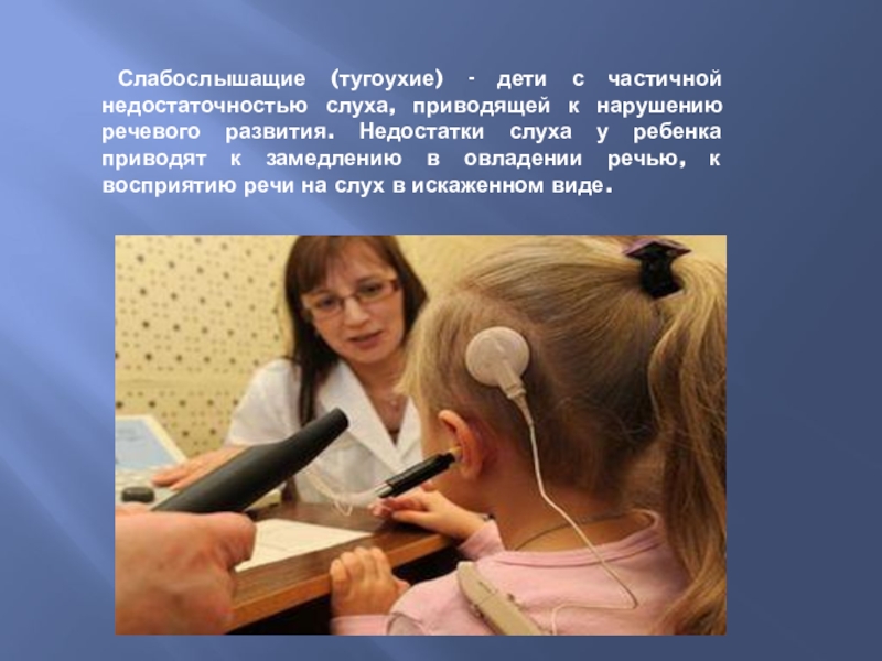 Слайд 8 Слабослышащие (тугоухие) - дети с частичной недостаточностью слуха, приводящей к