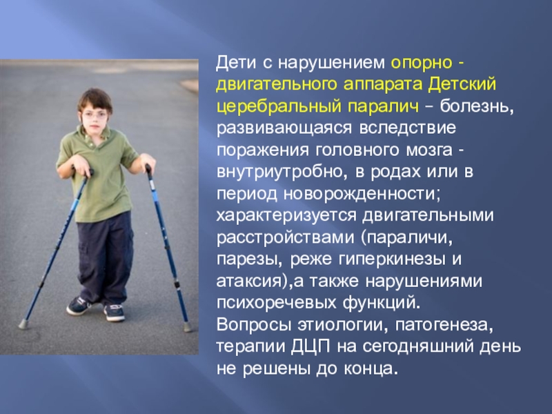 Слайд 5Дети с нарушением опорно - двигательного аппарата Детский церебральный паралич –