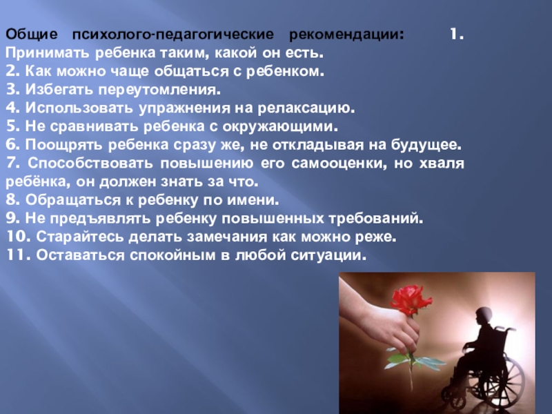 Слайд 18Общие психолого-педагогические рекомендации: 1.Принимать ребенка таким, какой он есть.