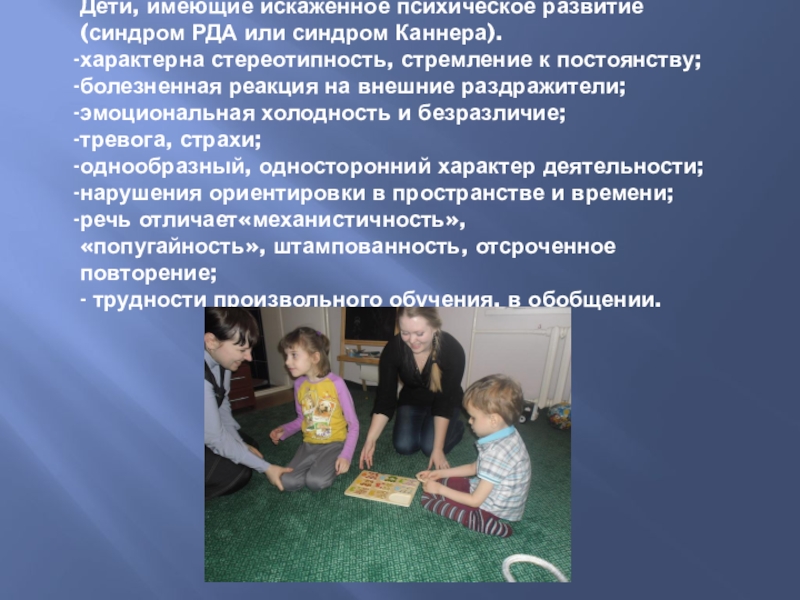 Слайд 14Дети, имеющие искаженное психическое развитие (синдром РДА или синдром Каннера).