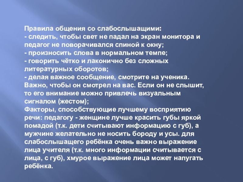 Факторы, способствующие лучшему восприятию речи: педагогу - женщине лучше красить губы яркой помадой (т.к. дети считывают информацию с губ), а мужчине желательно не носить бороду и усы. для слабослышащего ребёнка очень важно выражение лица учителя (т.к. много информации считывается с лица, с губ), хмурое выражение лица может напугать ребёнка.