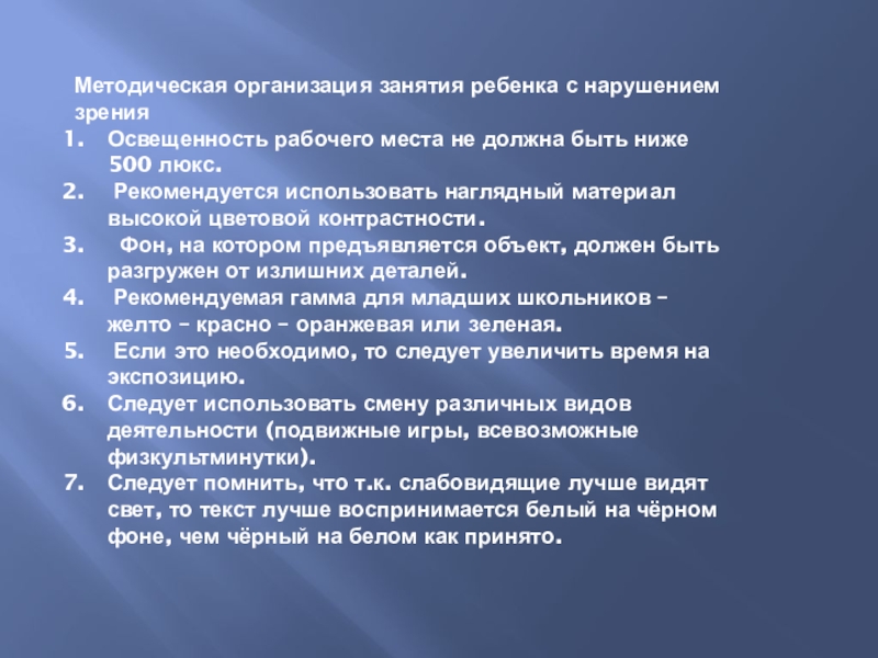 Слайд 12Методическая организация занятия ребенка с нарушением зрения